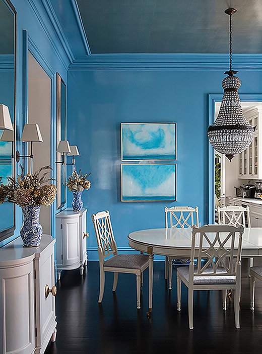 With its diverse range of undertones and ability to pair seamlessly with other hues this color proves why it is a standout among designersa rich midnight evokes a more reflective feeling suitable for a home library while a glossy aquamarine exudes just the right amount of energy within a living room. The armchairs in a christopher hyland fabric and side chairs in a clarence house velvet are antiques. Blue dining room pale blue dark wood dining room best home decor inspiration dining room blue dining room blue green dining room paint unique home architecture pale blue dining roo charisma design style setting architectural features for the home blue white dining room built ins arched molding with keystone.