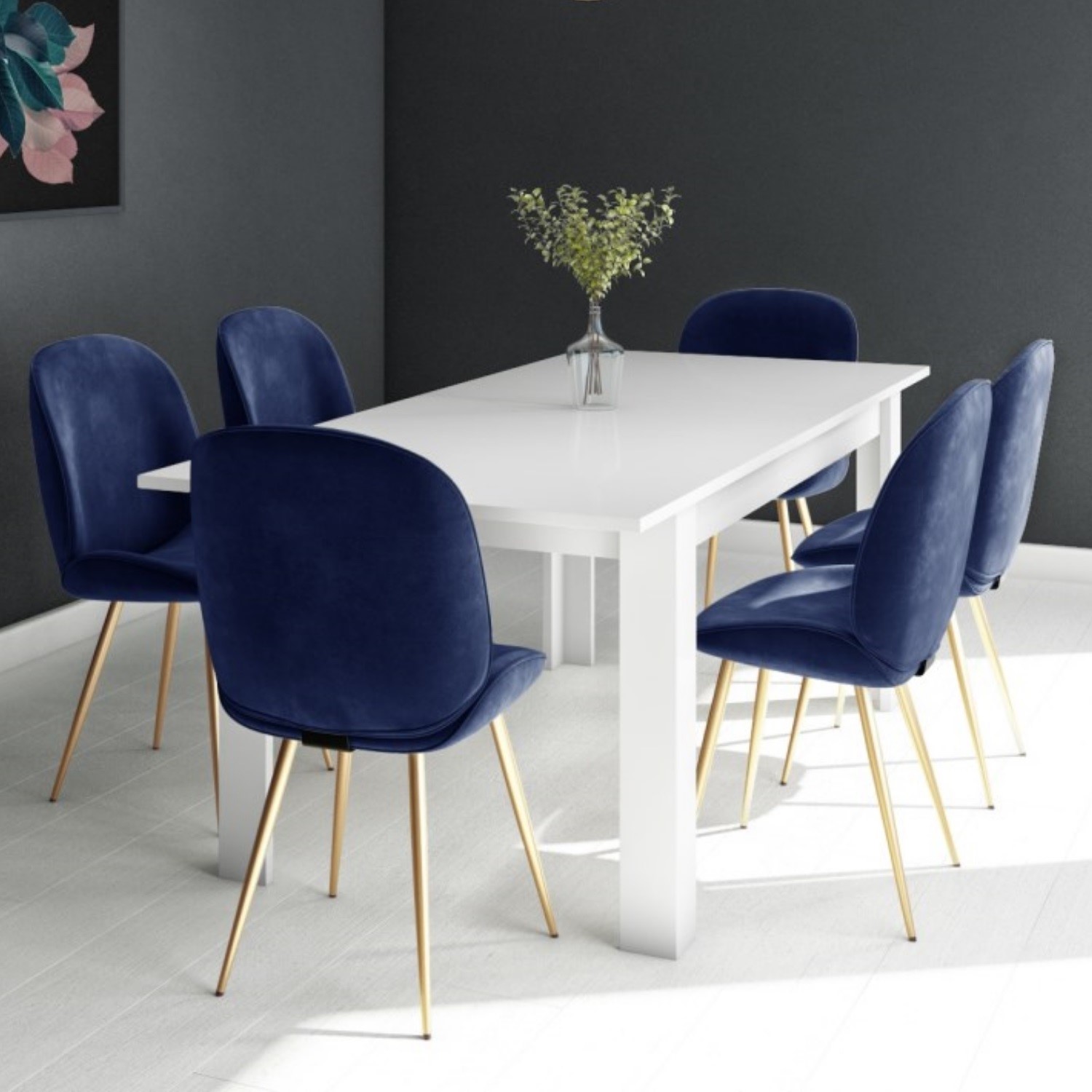 White Extendable Dining Table With 6 Gold Blue Velvet Chairs
