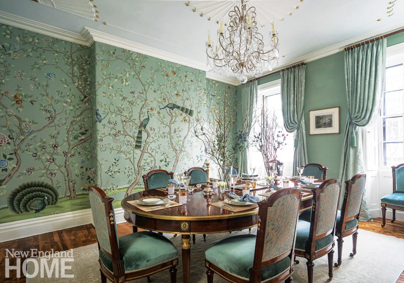 The formal dining area pairs bold florals with rich silks jewel tone leathers and plenty of mirrored sparkle. A quirky but gracious traditional dining room decorating a gracious traditional dining room with aqua walls wainscoting french provincial details and luxury fabrics.