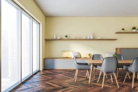 Front View Of Panoramic Dining Room With Yellow Walls Wooden